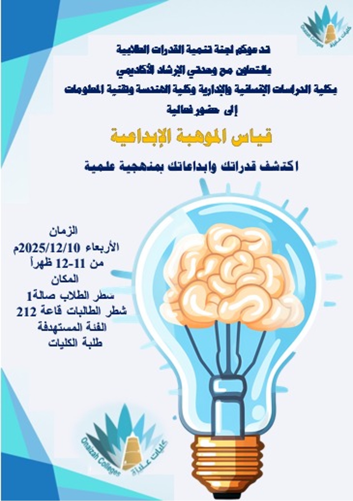10 ديسمبر 2025قياس الموهبة الإبداعية11 نوفمبر 2025هاكاثون تعلم وابتكر10 فبراير 2025تدشين برنامجي "اكتشف مواهبك وقدراتك" و" إثراء الموهوبين"
