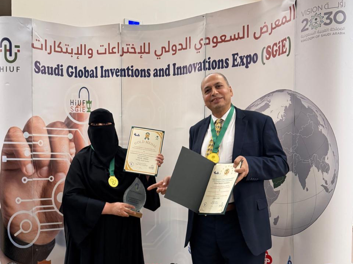 Dr. Bakr Mohammed Saeed and Dr. Rehab Abdullah Alrumaih received the gold medal and a special award at the Saudi Global Inventions & Innovations Expo (SGiE) 2025 in Jeddah for their virtual reality–based phobia treatment project. The project addresses phobia disorders using interactive virtual reality environments, representing an advanced model in digital psychological therapy. The project earned high recognition from the judging panels for its innovative concept and effective practical application.