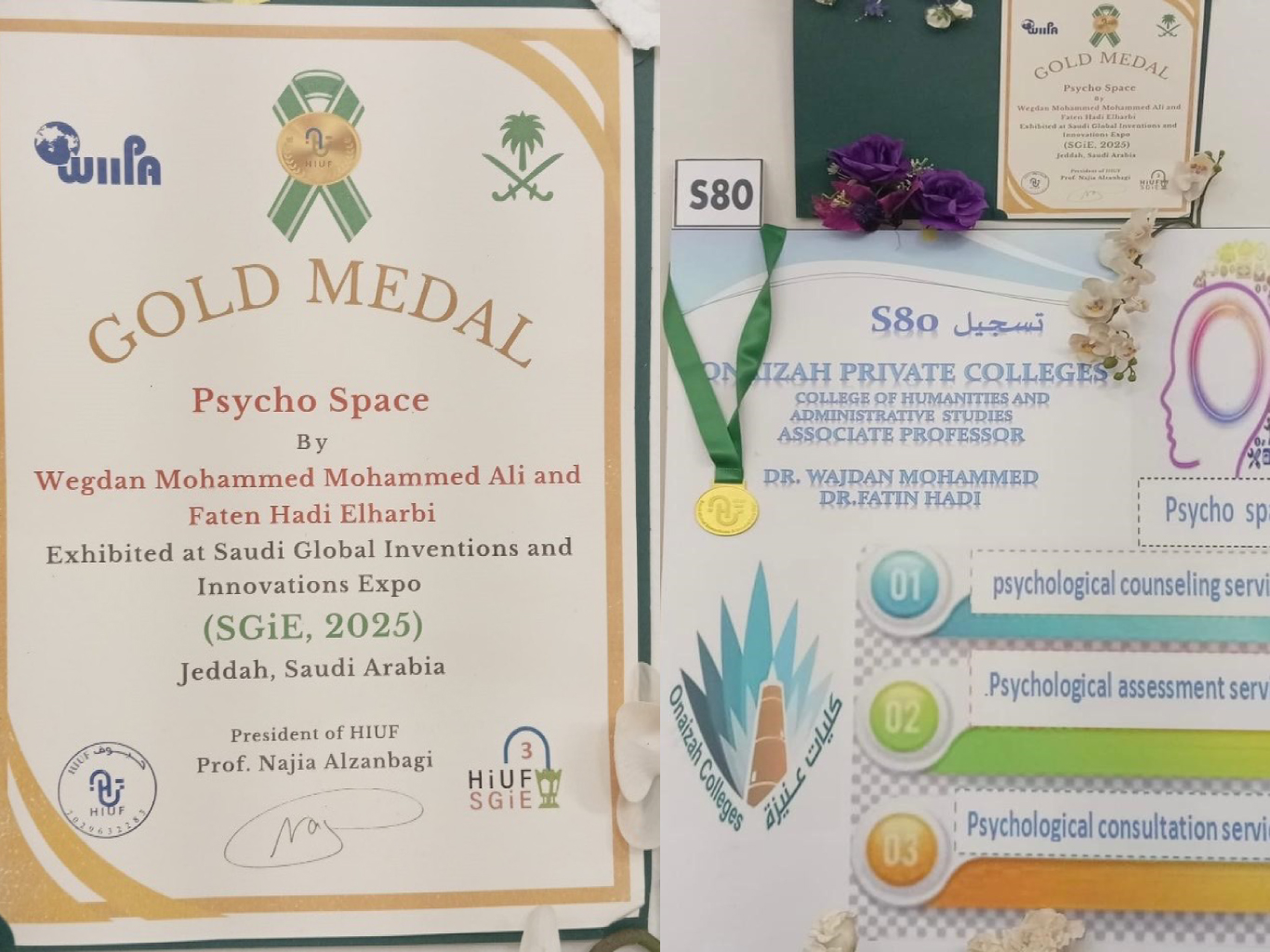 Dr. Faten Hadi Al-Harbi and Dr. Wijdan Mohammed were awarded the gold medal for their patented innovation “Psycho-SP,” officially registered with the Saudi Authority for Intellectual Property. The project introduces an intelligent platform that redefines the delivery of mental health services by facilitating effective communication between beneficiaries and psychological specialists. This innovation represents a qualitative leap in the digital counseling environment, integrating technical efficiency with the growing societal need for accessible psychological services.