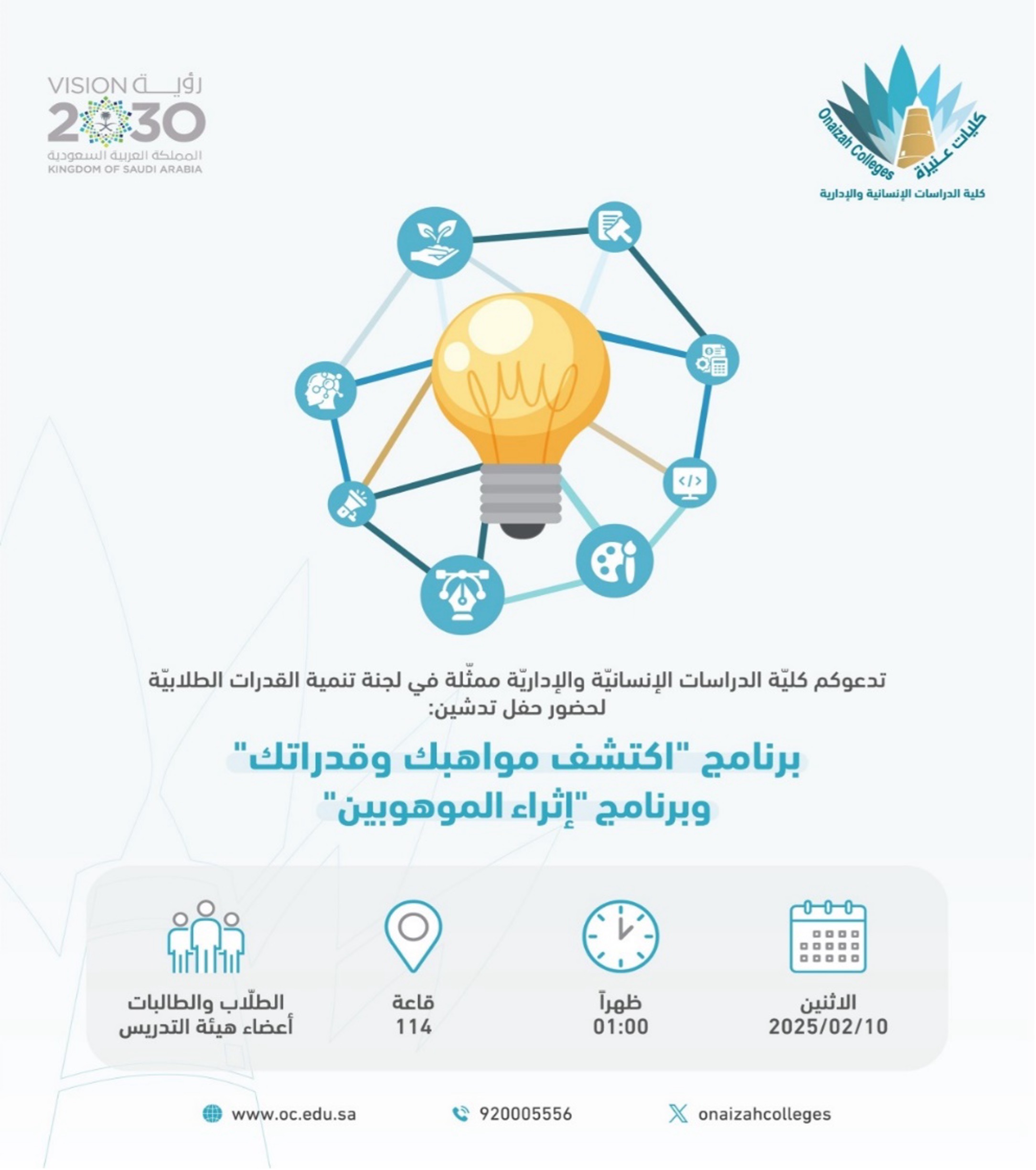 10 ديسمبر 2025قياس الموهبة الإبداعية11 نوفمبر 2025هاكاثون تعلم وابتكر10 فبراير 2025تدشين برنامجي "اكتشف مواهبك وقدراتك" و" إثراء الموهوبين"
